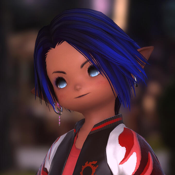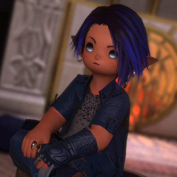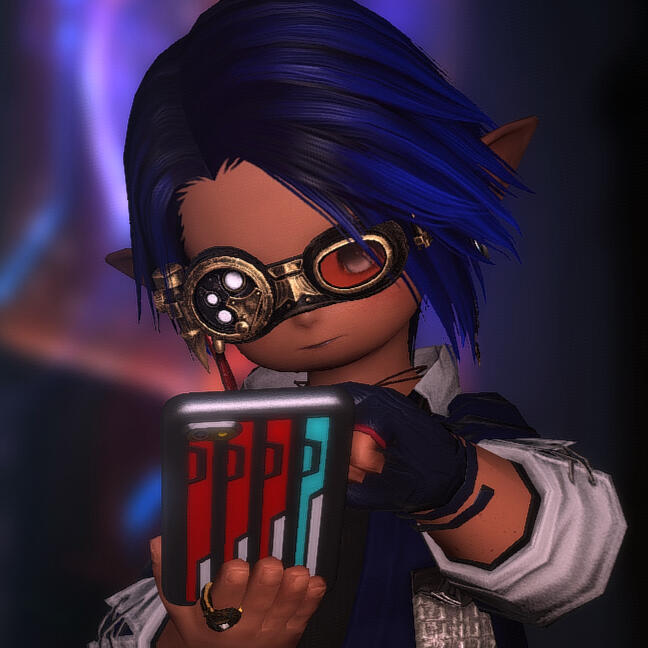 AppearanceNiniji stands at medium height for a lalafell. They have lightly tanned skin and bright cyan eyes...which are almost always obscured by a mask, a pair of sunglasses, or a set of goggles.The natural color for their sideswept hair is a deep indigo, which they like to highlight with bright blue highlights most of the time. When they are using one of their many aliases, they will usually wear a wig or color their hair differently to fit the 'part' and look distinctive from their usual look.They tend to dress in darker colors and lean into their androgyny most of the time, though they are partial to wearing blue. Of course, depending on their alias, they might wear something completely out of character to sell their con artist act.Niniji has a gruff, alto voice, and normally speaks in a casual, Limsan accent, but this is not their original way of speaking. Depending on the situation, they can speak in a number of ways.